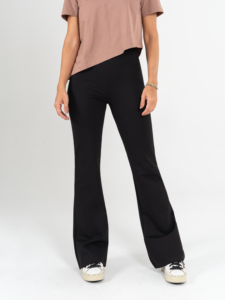 Pantalón flare stretch, tipo legging, tiro alto, tono negro, silueta ajustada.