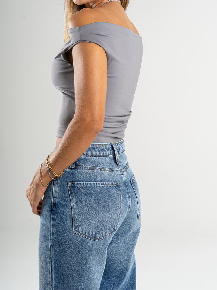 Top cuello bandeja, stretch, fondo entero, tono gris