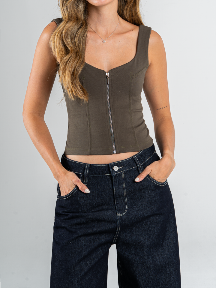 Top manga sisa, cierre frontal, stretch, tejido de punto, tono verde.