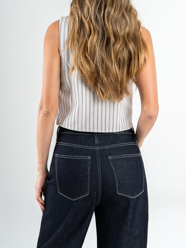 Chaleco escote V, manga sisa, tono crudo, tejido plano, amarre delantero.