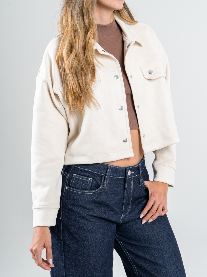 Chaqueta efecto piel, tacto suave, cuello con solapa, tono beige, botones delanteros