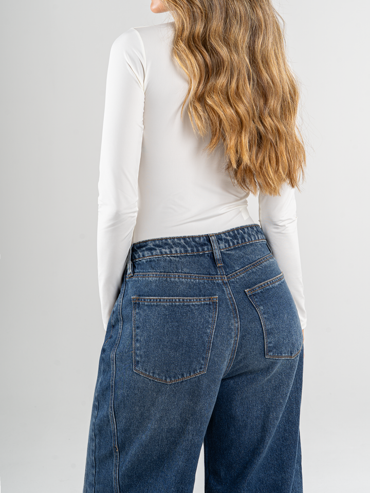 Body manga larga, cuello redondo, tono crudo, cierre en bajo con botones a presión.