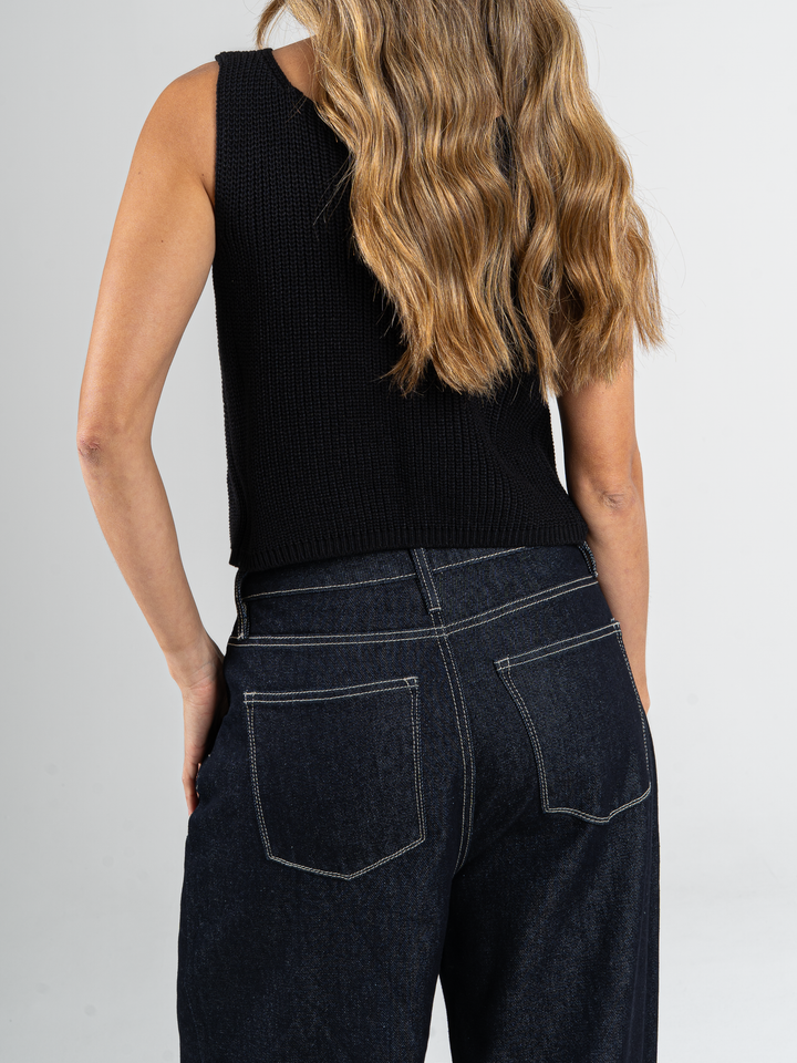 Chaleco tejido acanalado, con broche delantero, tono negro, silueta amplia