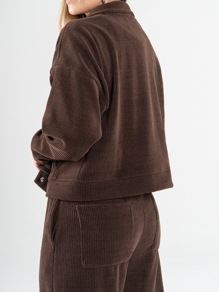 Chaqueta stretch, tejido acanalado, botones delanteros, tono cafe