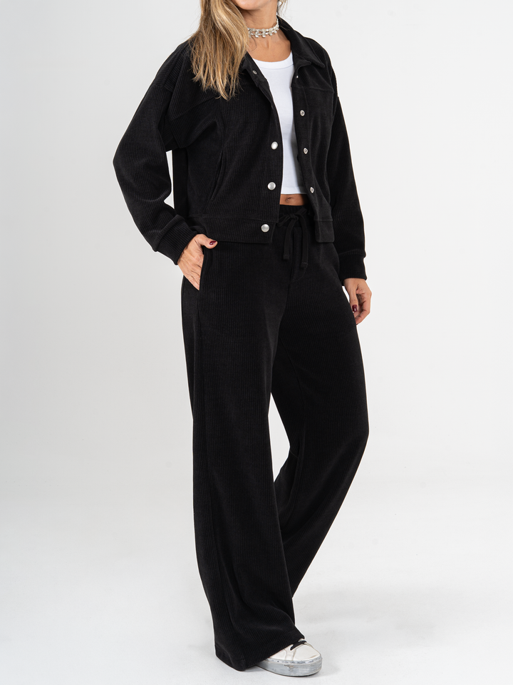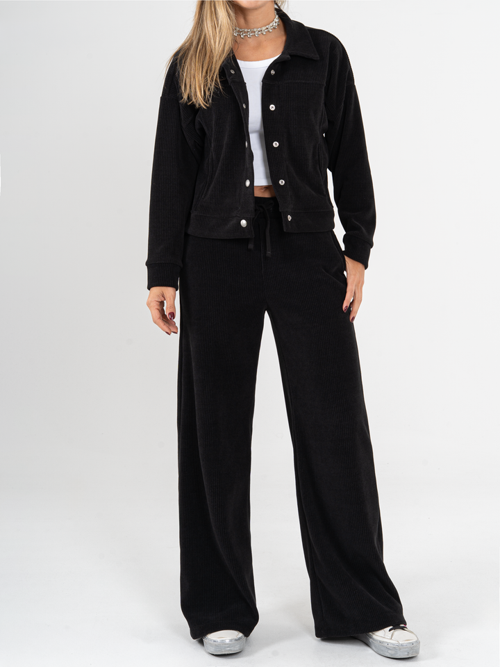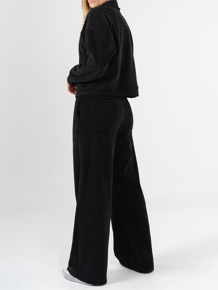 Pantalón wide leg, tejido acanalado, bolsillo en costado, pretina resortada, tono negro, silueta amplia.
