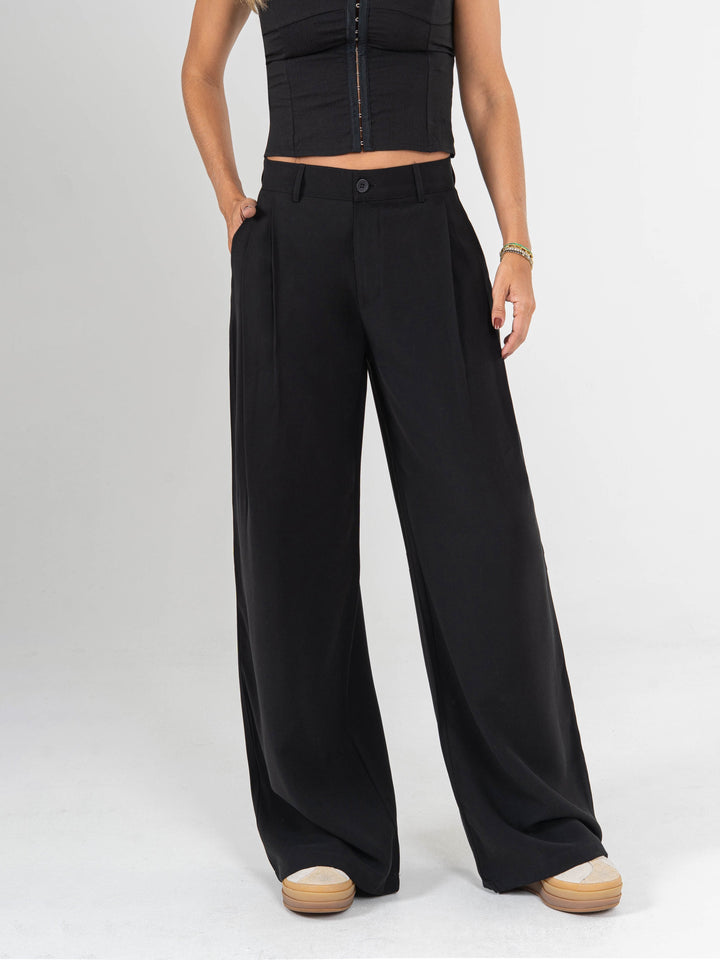 Pantalón palazzo, con prenses, tejido plano liviano, tiro alto, tono negro, bolsillo ribete, silueta amplia.