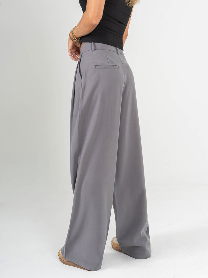 Pantalón palazzo, con prenses, tejido plano liviano, tiro alto, tono gris, bolsillo ribete, silueta amplia.