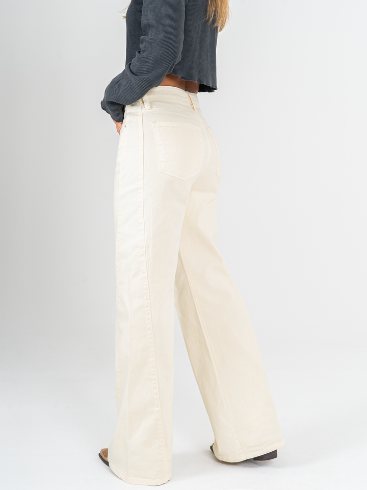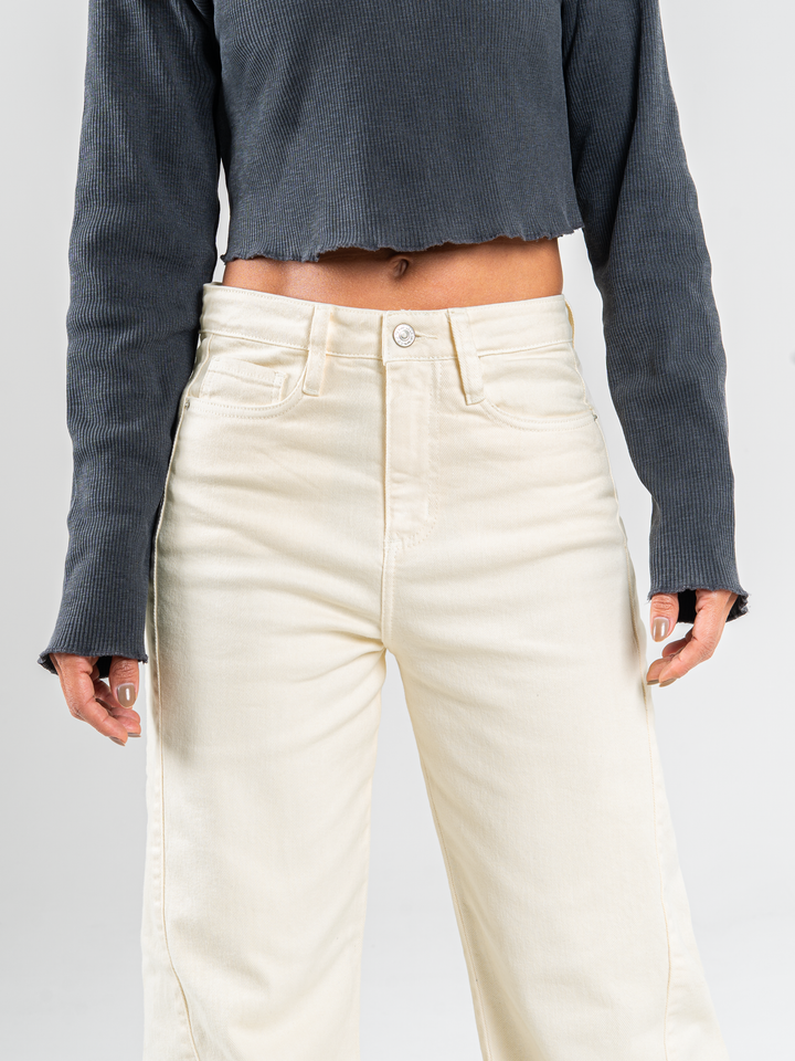 Pantalón palazzo stretch, tiro alto, tono beige, diseño cinco bolsillos, silueta holgada