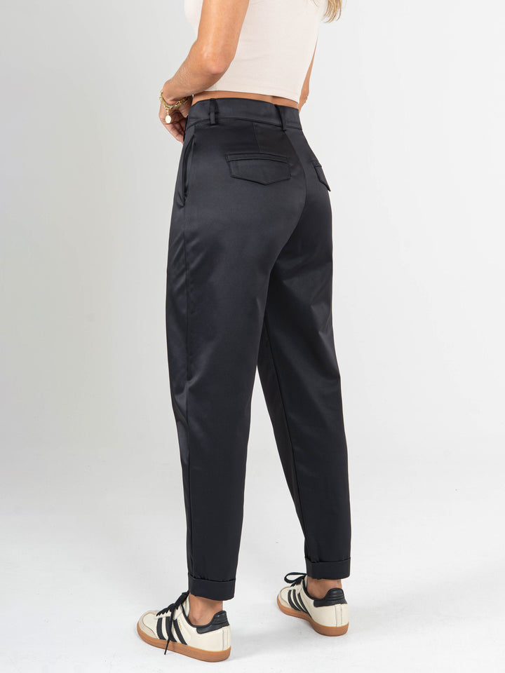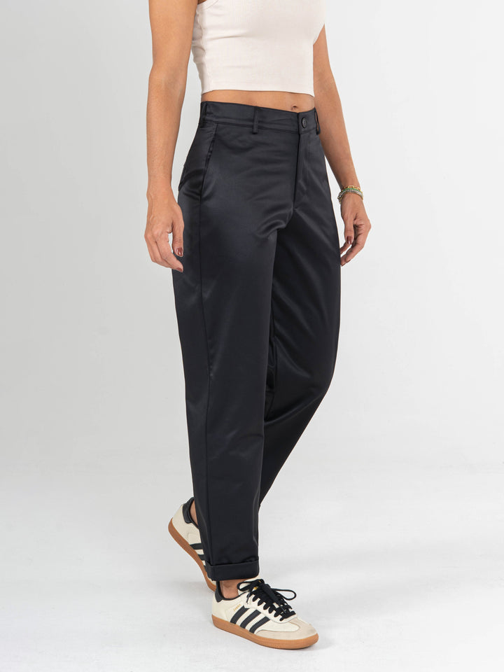 Pantalón slouchy, sin prenses, tono negro, tejido plano liviano, tiro alto, bolsillo ribete, silueta amplia.