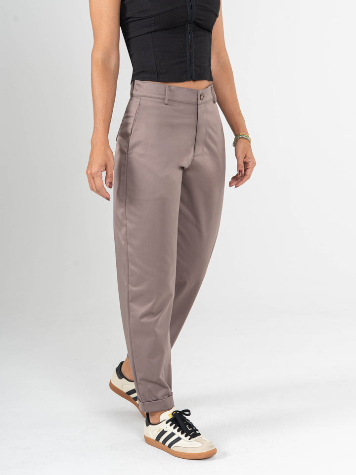Pantalón slouchy, sin prenses, tono cafe, tejido plano liviano, tiro alto, bolsillo ribete, silueta amplia.