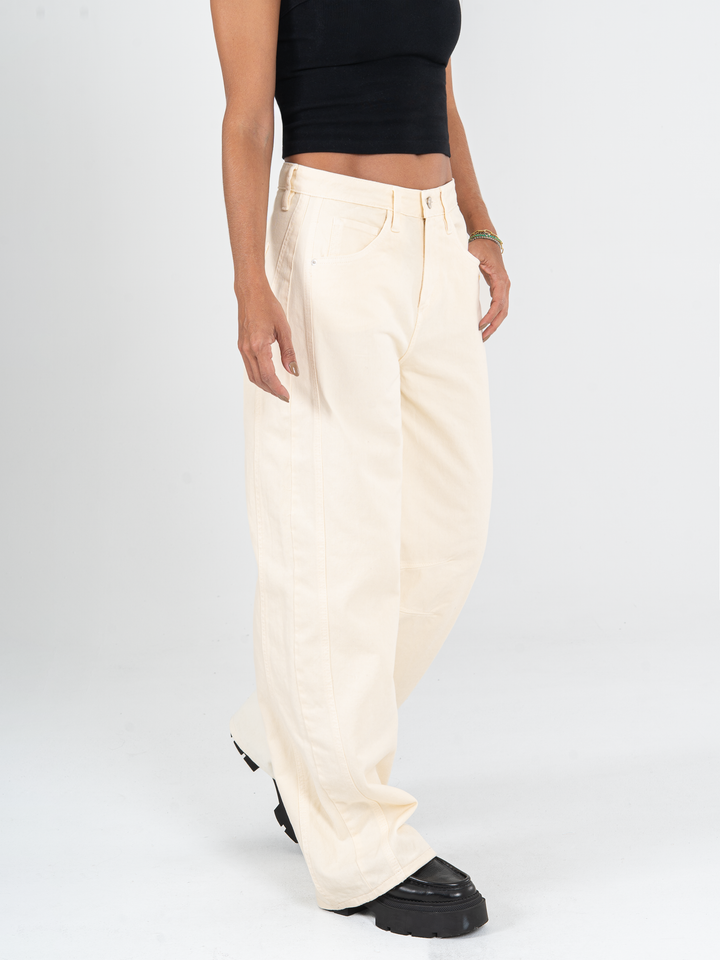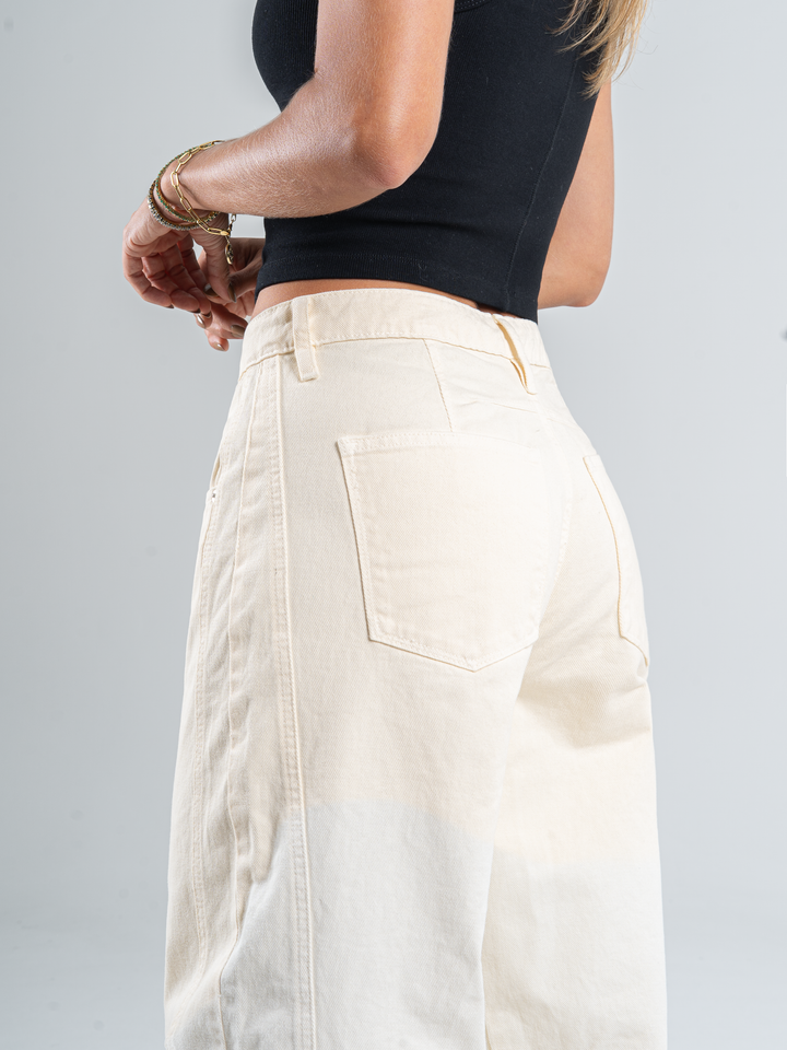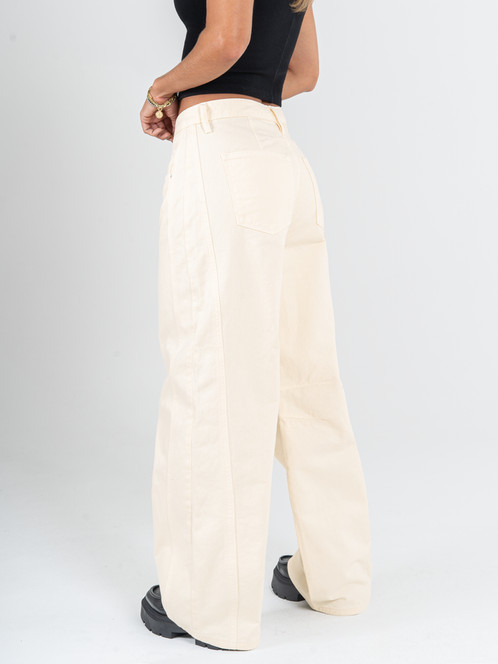 Ref: 0620043 Pantalón wide leg, rígido, tiro alto, corte en costado, tono beige.