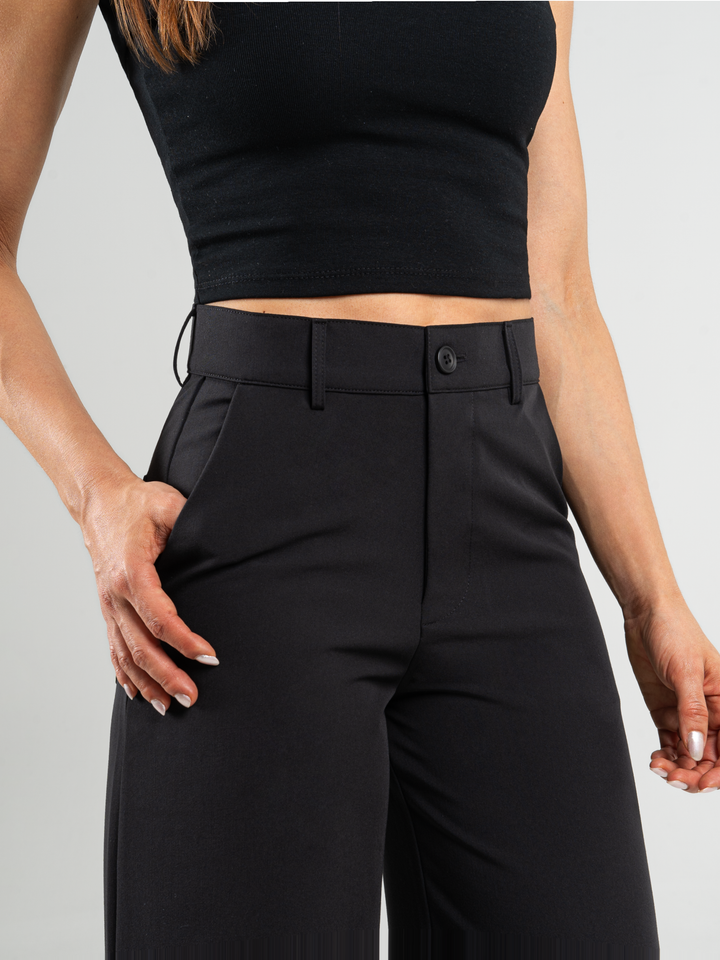 Pantalón palazzo, stretch, sin prenses, tejido plano liviano, tono negro, tiro alto, bolsillo diagonal, silueta amplia.
