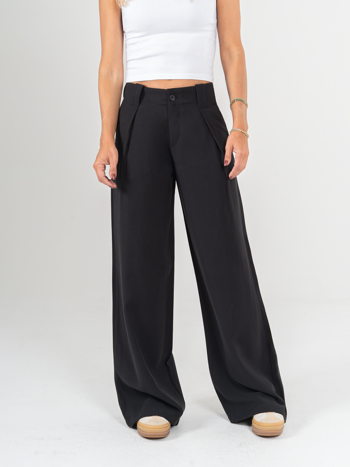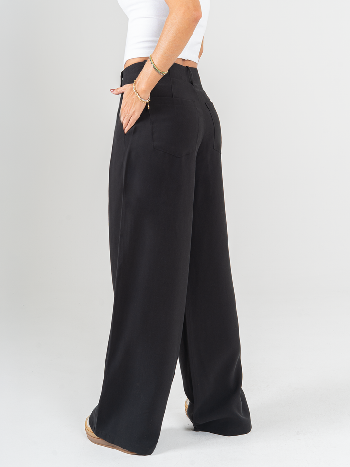 Pantalón palazzo, prenses, detalle en pretina, tono negro, tejido plano liviano, tiro alto, bolsillo ribete, silueta amplia.