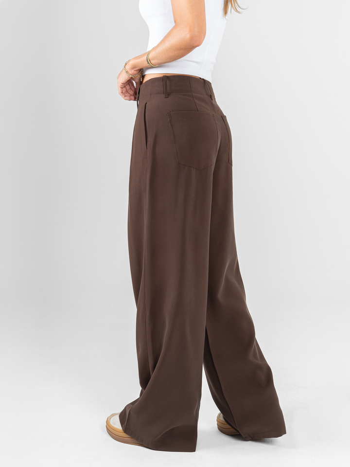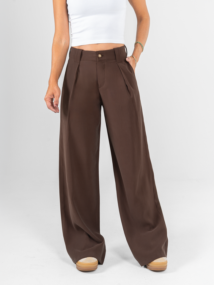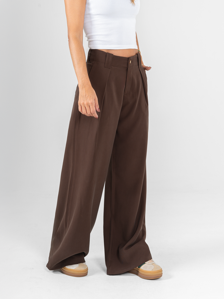 Pantalón palazzo, prenses, detalle en pretina, tono café, tejido plano liviano, tiro alto, bolsillo ribete, silueta amplia.