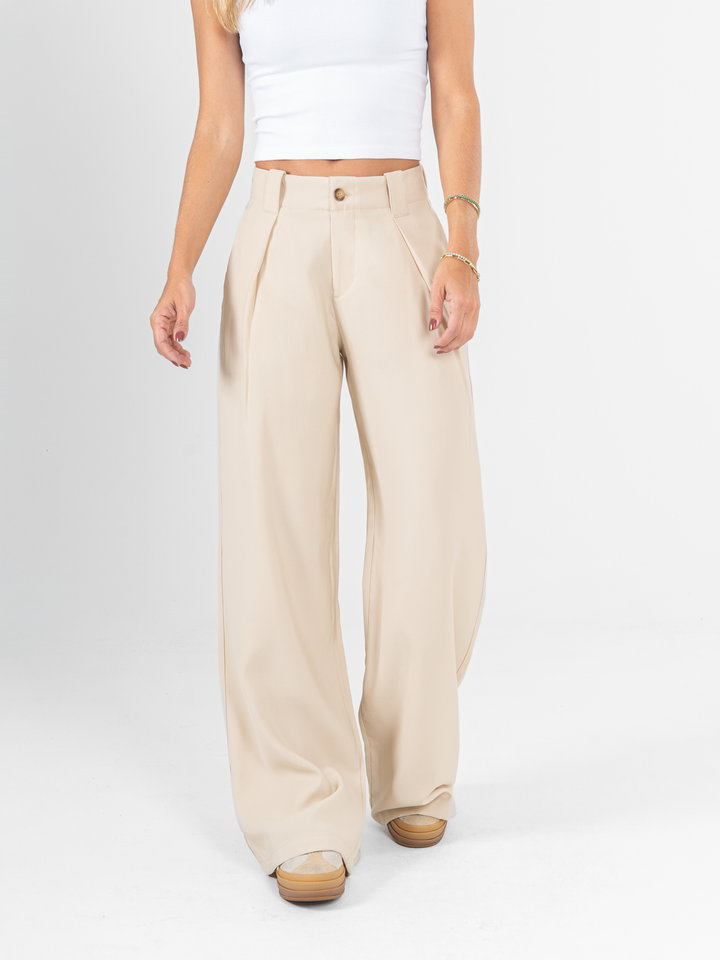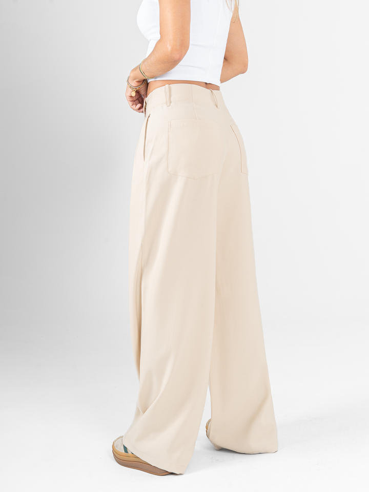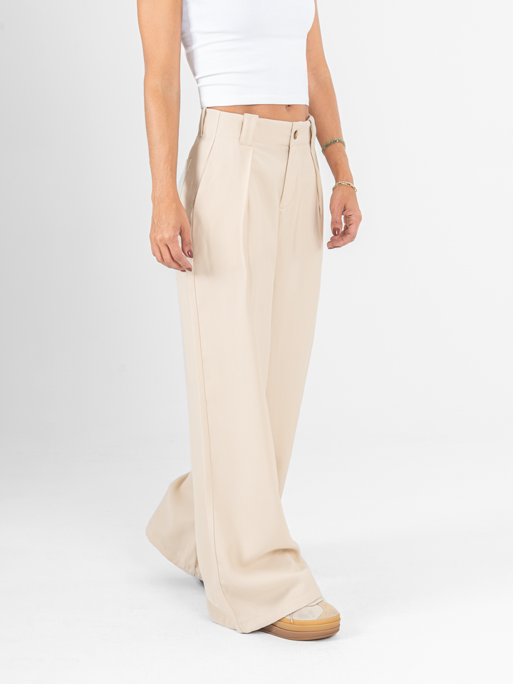 Pantalón palazzo, prenses, detalle en pretina, tono arena, tejido plano liviano, tiro alto, bolsillo ribete, silueta amplia.