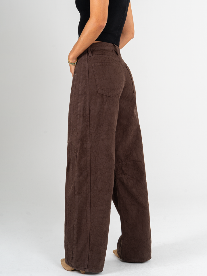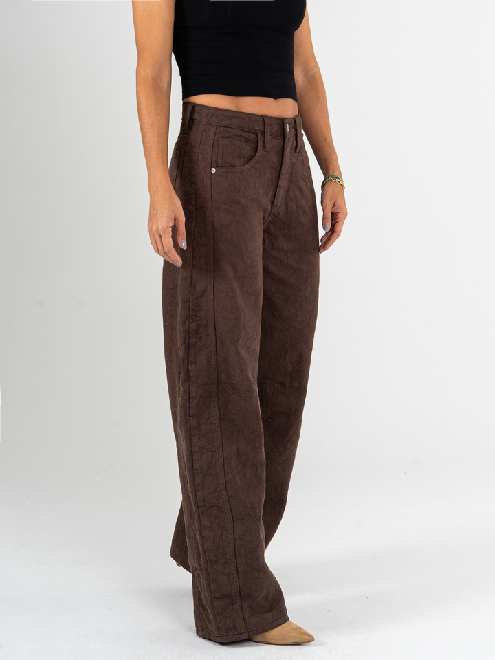 Pantalón wide leg, tiro alto, detalle de tela bordada, rígido, tono cafe, diseño 5 bolsillos, cintura ajustada y silueta amplia de pierna recta.