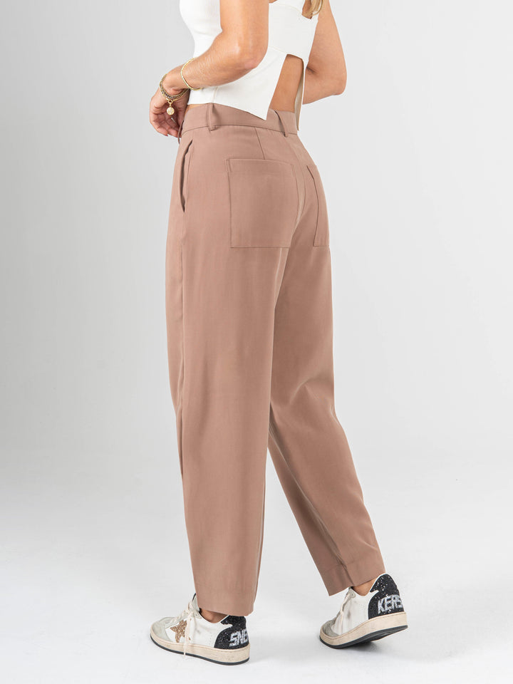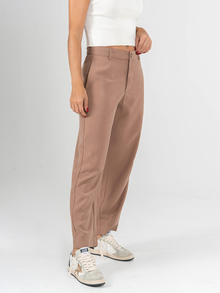 Pantalón slouchy, sin prense, tono cafe, tejido plano liviano, tiro alto, bolsillo diagonal, silueta amplia.