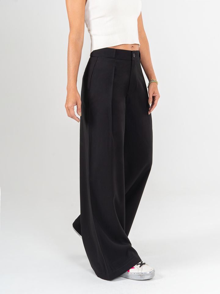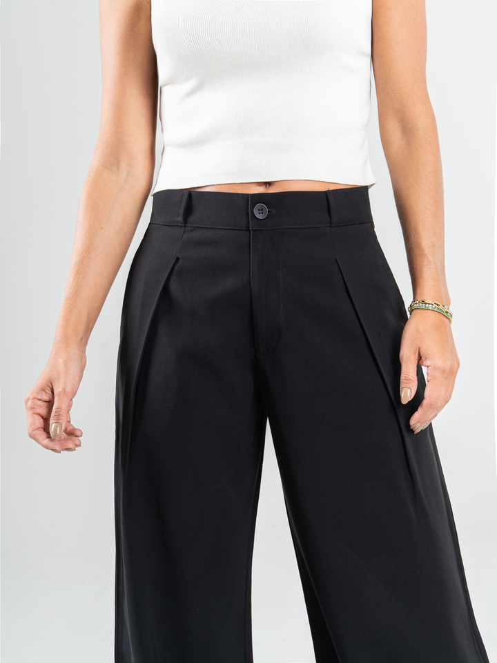 Pantalón palazzo, prenses, tono negro, tejido plano liviano, tiro alto, bolsillo ribete, silueta amplia.