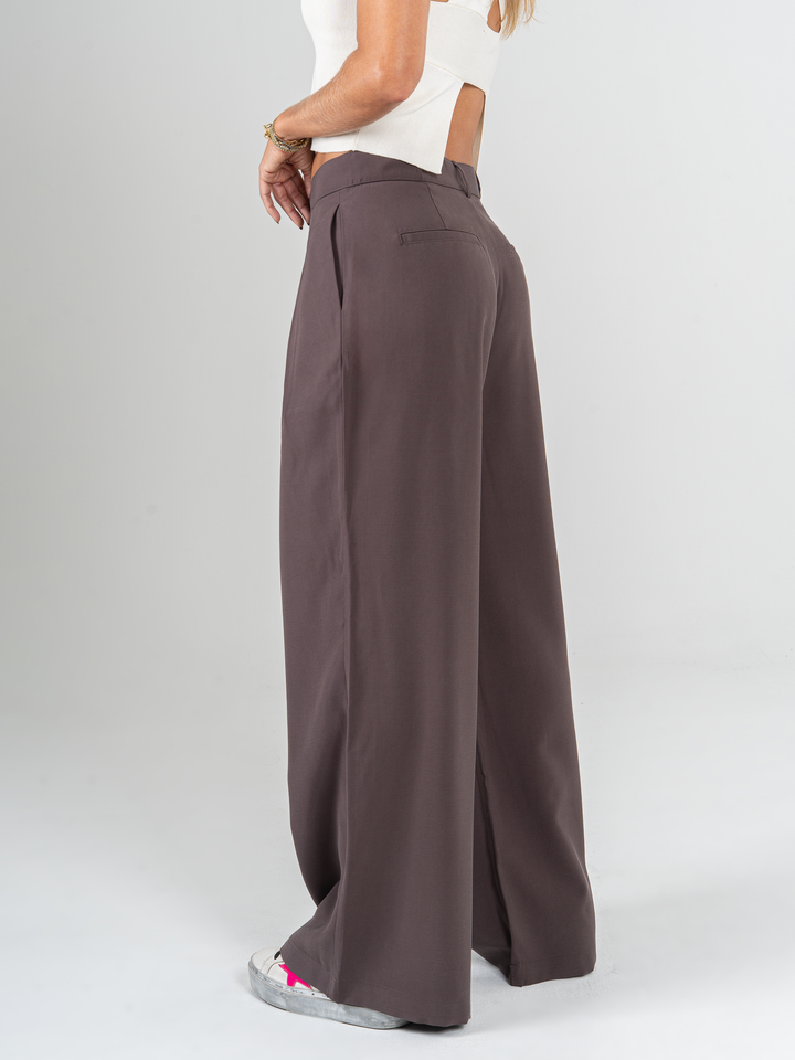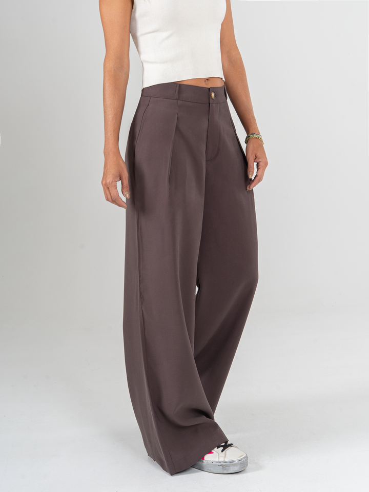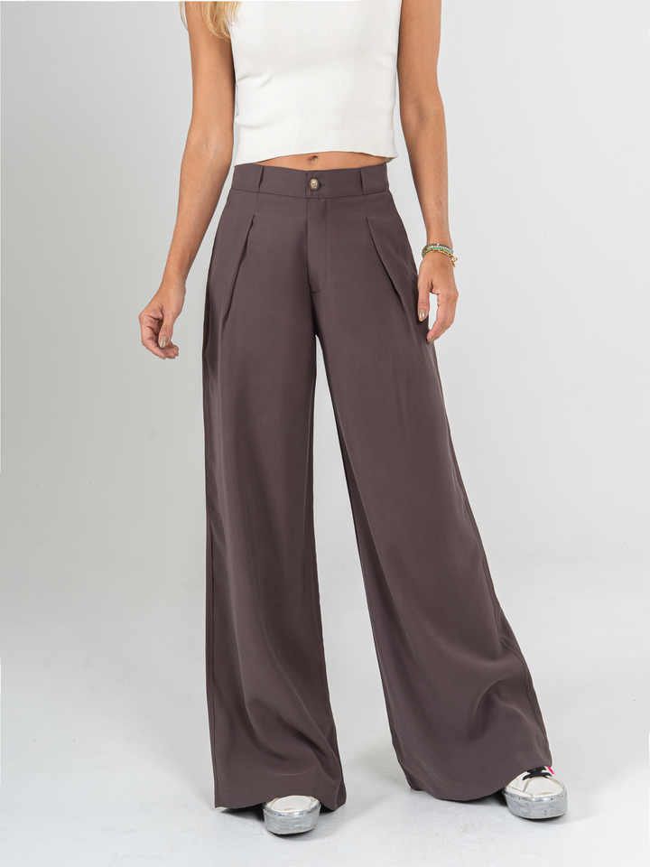 Pantalón palazzo, prenses, tono cafe, tejido plano liviano, tiro alto, bolsillo ribete, silueta amplia.