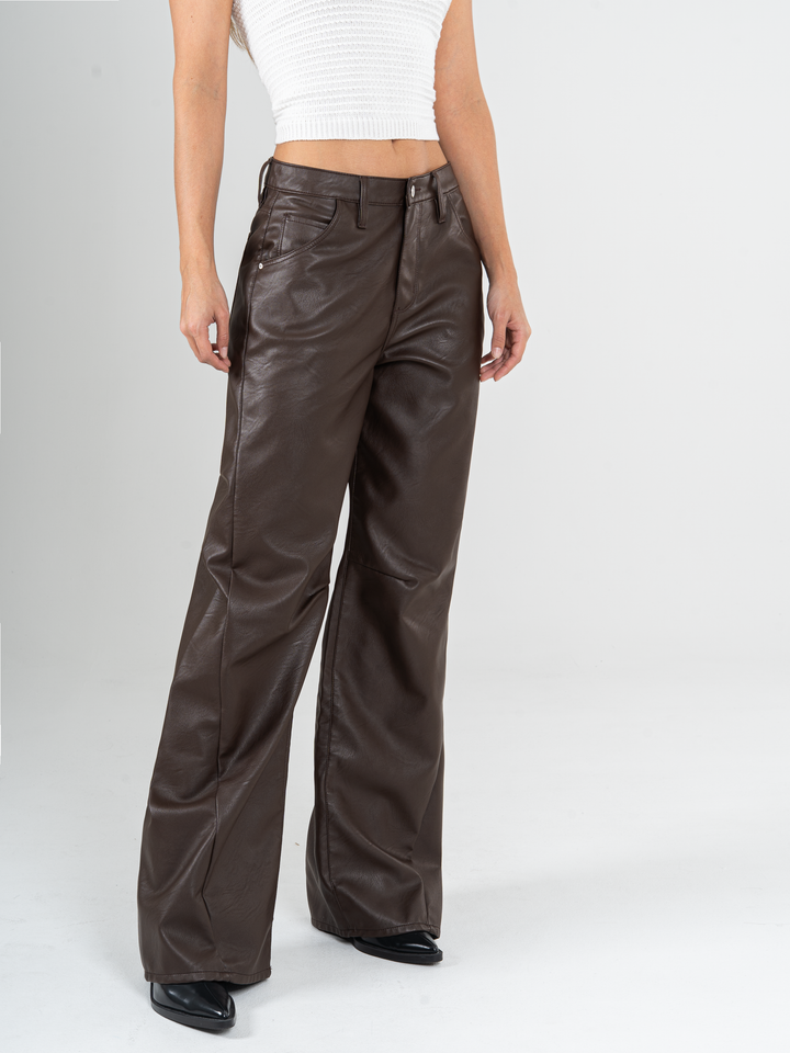 Pantalón wide leg, rígido, tiro alto, con cortes, efecto cuero, tono cafe, diseño cinco bolsillos, silueta amplia