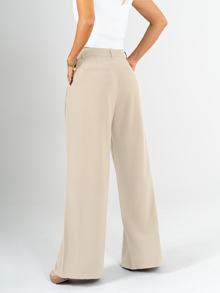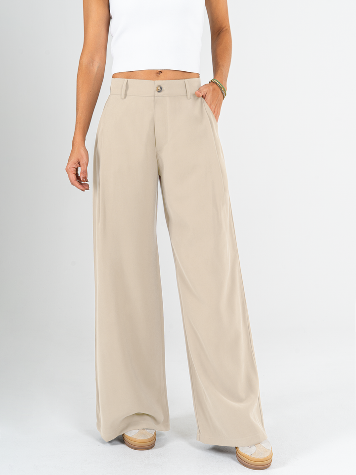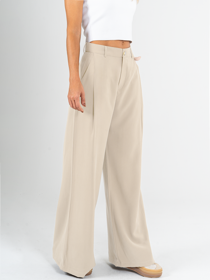 Pantalón palazzo, prenses, tono arena, tejido plano liviano, tiro alto, bolsillo ribete, silueta amplia.