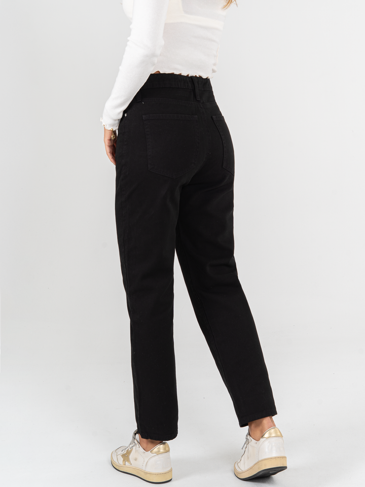 Pantalón mom fit, rígido, tiro alto, tono negro, cintura ajustada, pierna holgada, diseño cinco bolsillos.