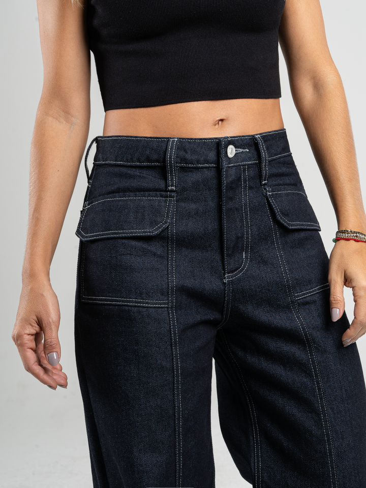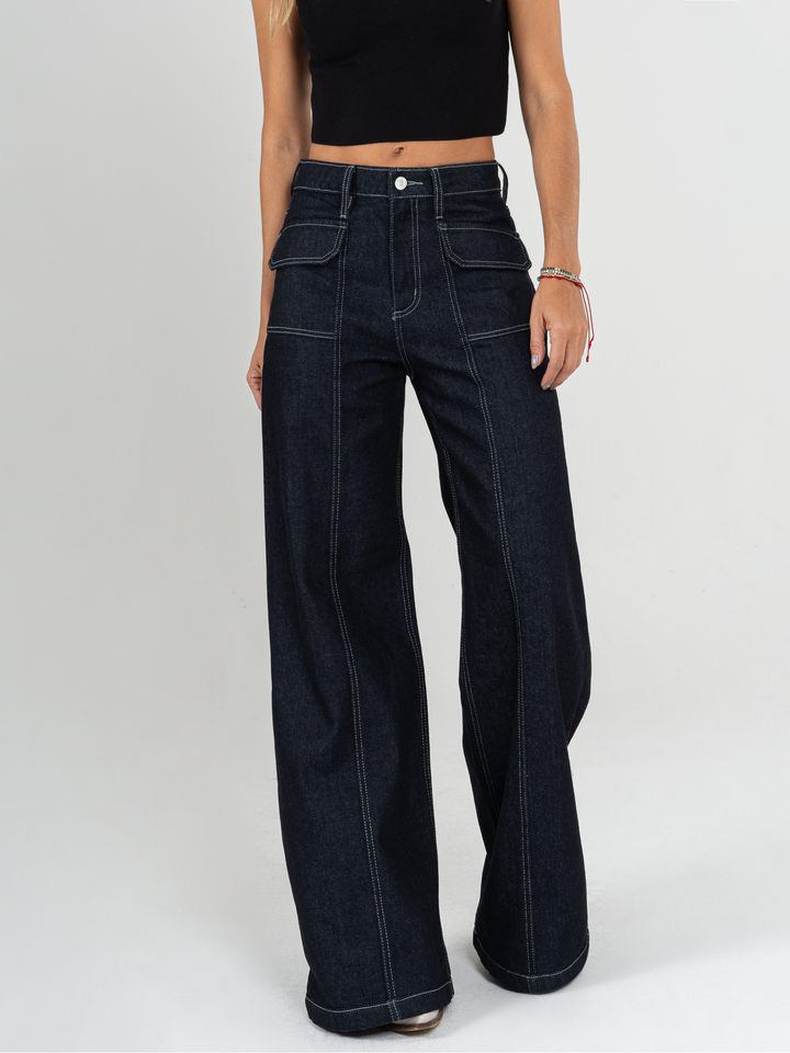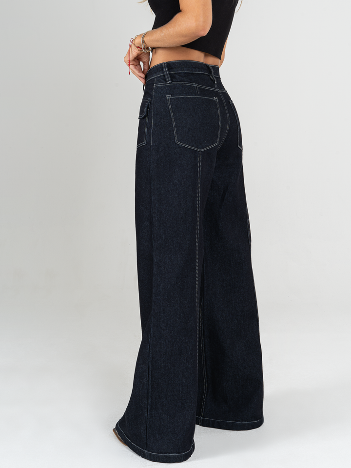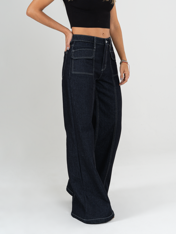 Jean palazzo, rígido, bolsillos delanteros, tiro alto, tono azul oscuro, cintura ajustada y pierna holgada.
