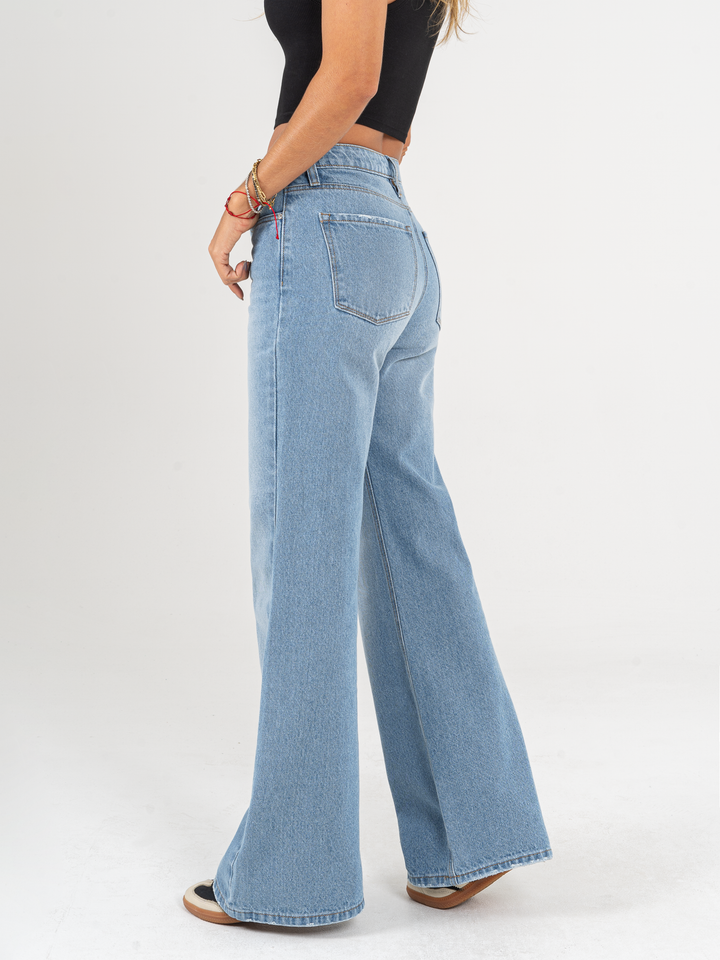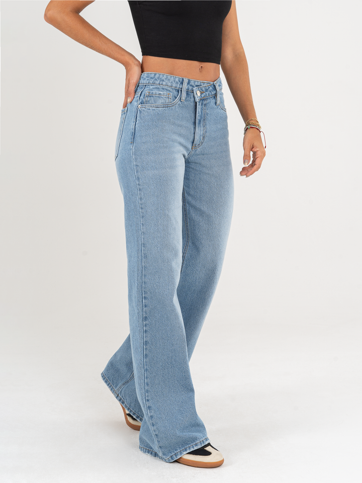 Ref: 064977 Jean Mom Flare, rígido, tiro alto, tono azul medio, detalle en pretina.