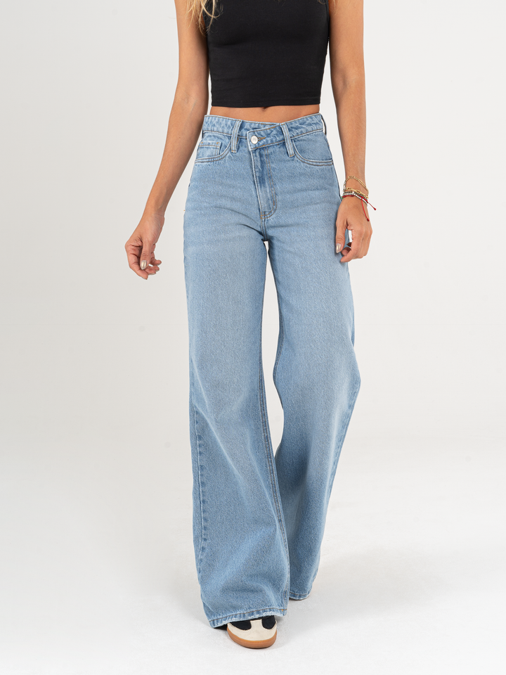Jean Mom Flare, rígido, tiro alto, tono azul medio, detalle en pretina, diseño cinco bolsillos, cintura ajustada, pierna holgada.