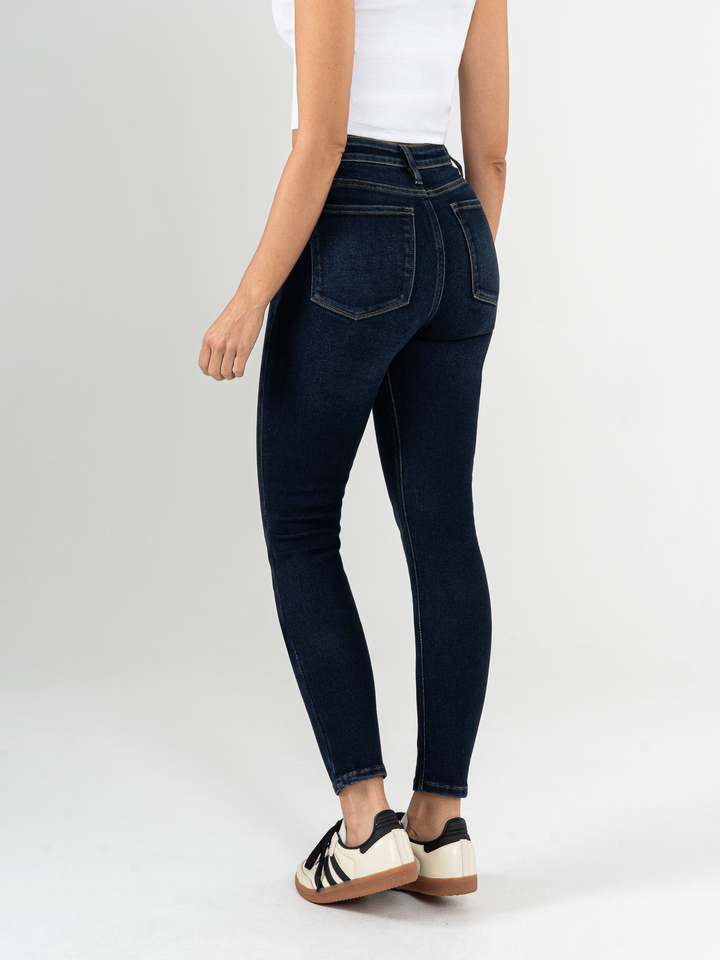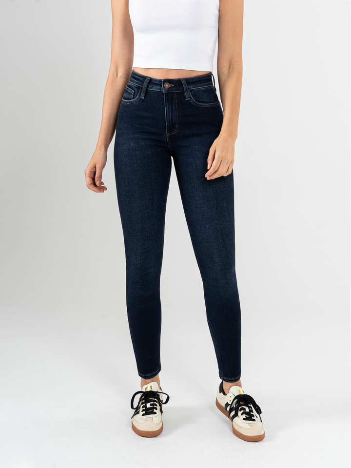 Jean Skinny stretch, tiro alto, tono azul oscuro. cintura ajustada y diseño cinco bolsillos.