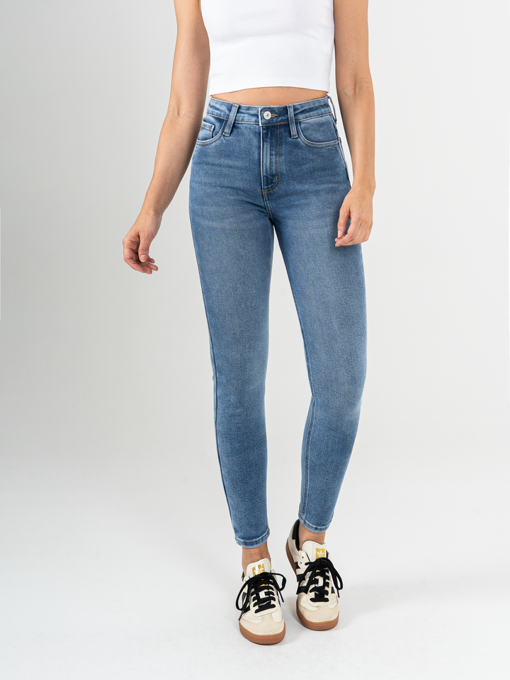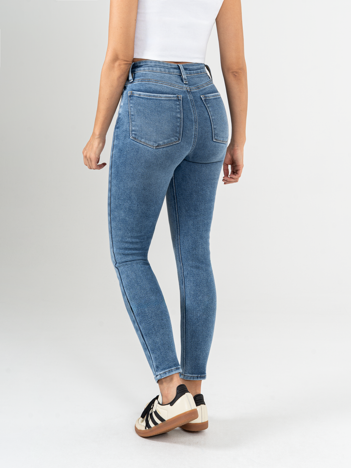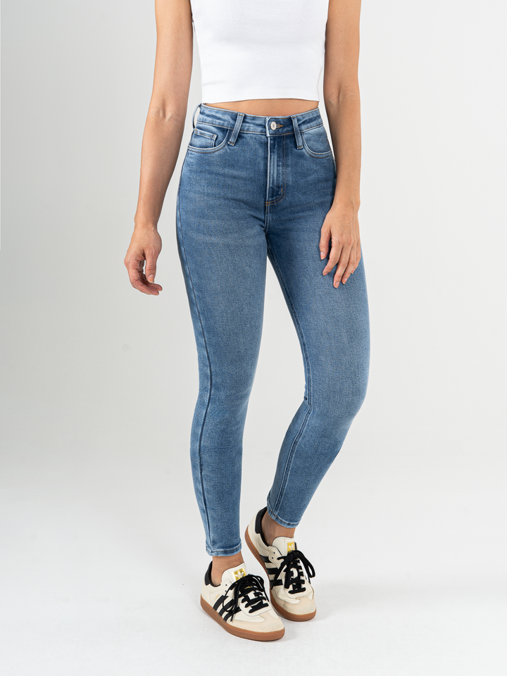 Jean Skinny stretch, tiro alto, tono azul medio, cintura ajustada y diseño cinco bolsillos.