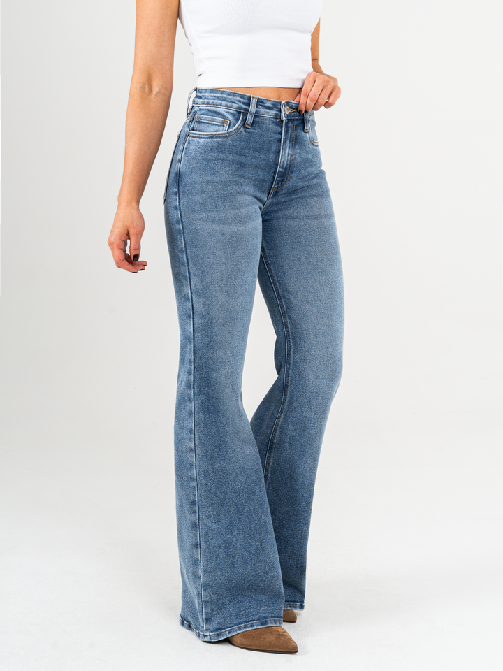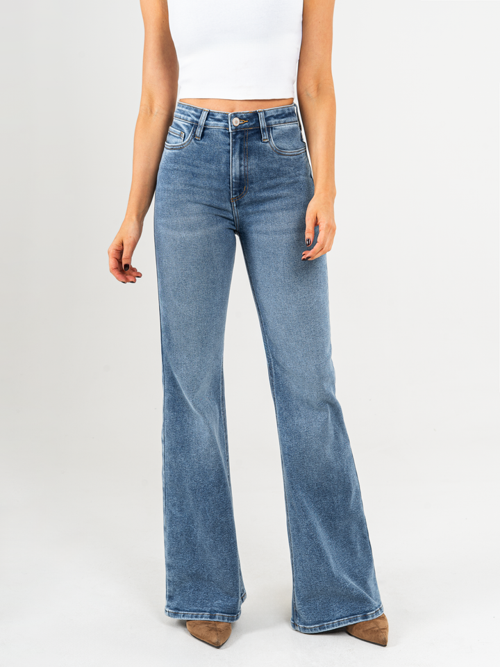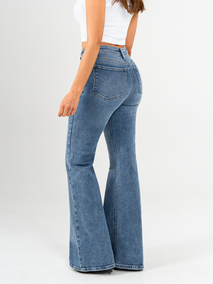 Jean flare stretch, bota ancha, tiro alto, tono azul medio, silueta ajustada, diseño cinco bolsillos.