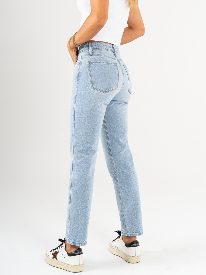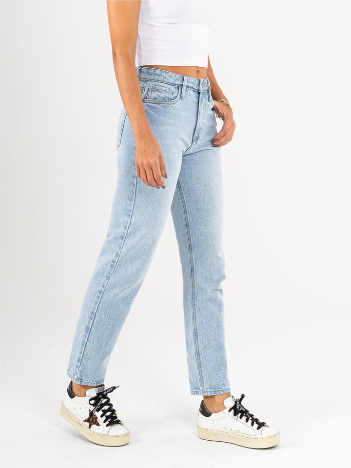 Jean Mom fit, rígido, tiro alto, tono azul medio, cintura ajustada pierna holgada, diseño cinco bolsillos.