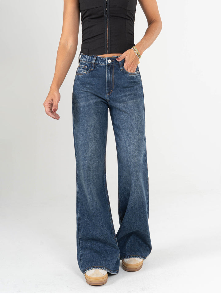 Jean Mom Flare, rígido, tiro alto, tono azul oscuro, diseño cinco bolsillos, cintura ajustada, pierna holgada.