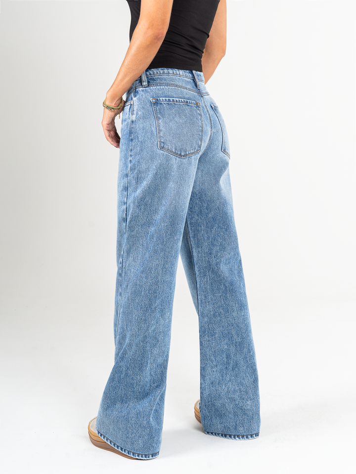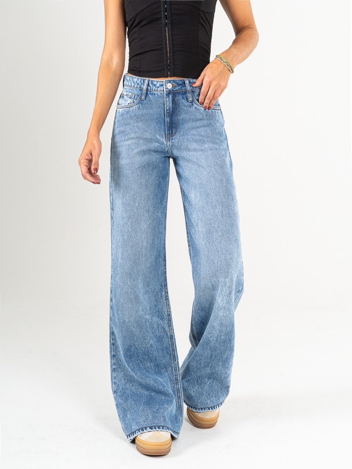 Jean Mom Flare, rígido, tiro alto, tono azul medio, diseño cinco bolsillos, cintura ajustada, pierna holgada.