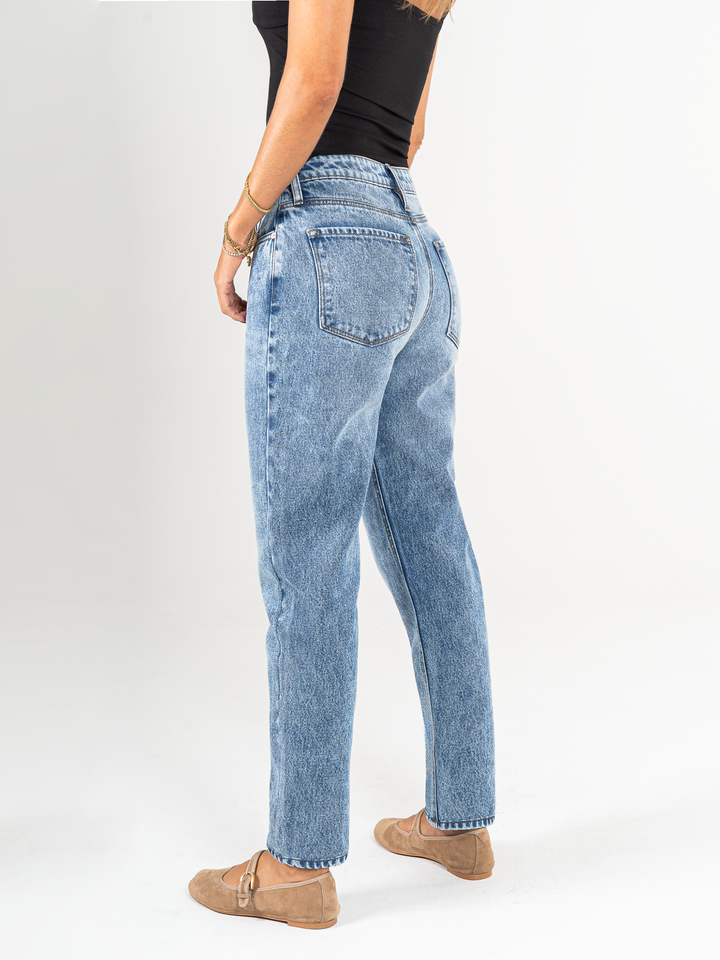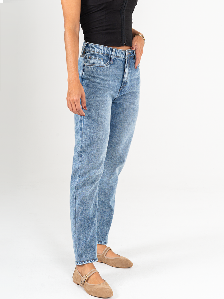 Jean Mom fit, rígido, tiro alto, tono azul medio, cintura ajustada pierna holgada, diseño cinco bolsillos.