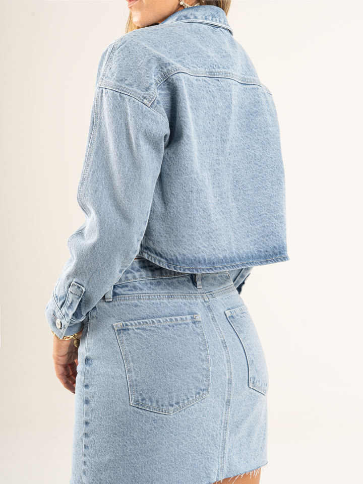 Chaqueta cropped en denim rígido, botones delanteros, cuello con solapa tono azul medio.