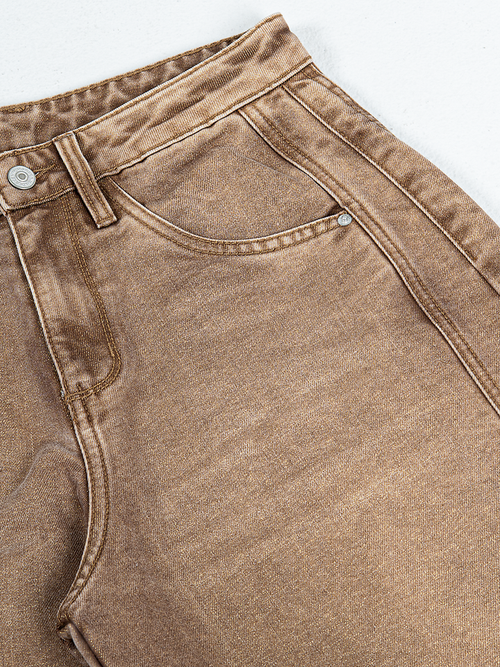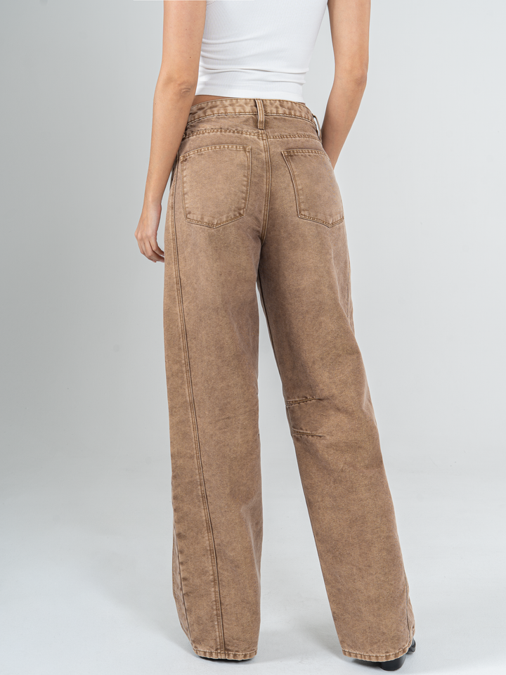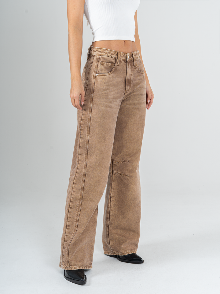 Jean wide leg, tiro alto, detalle de tela con brillo, rígido, tono cafe con desgaste, diseño 5 bolsillos, cintura ajustada y silueta amplia de pierna recta.