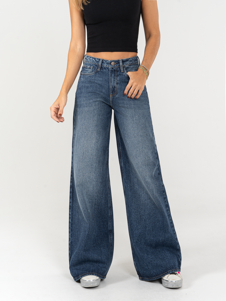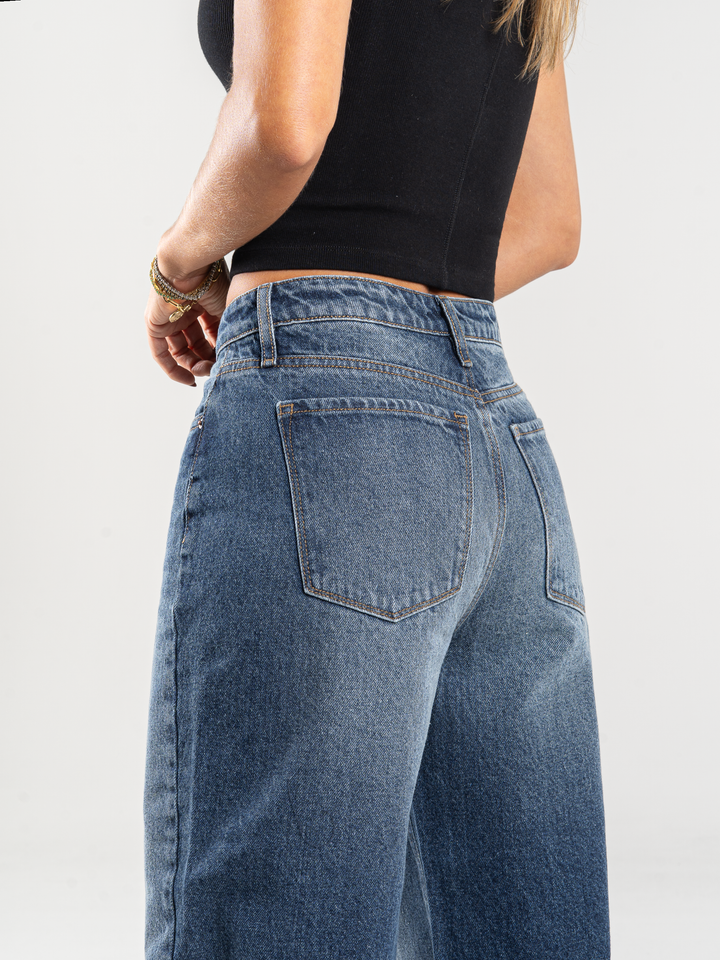 Jean palazzo, rígido, tiro alto, tono azul oscuro, cintura ajustada pierna holgada, diseño cinco bolsillos.