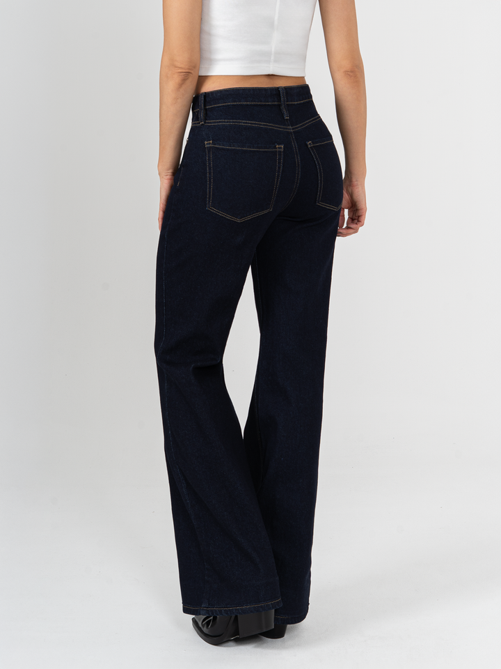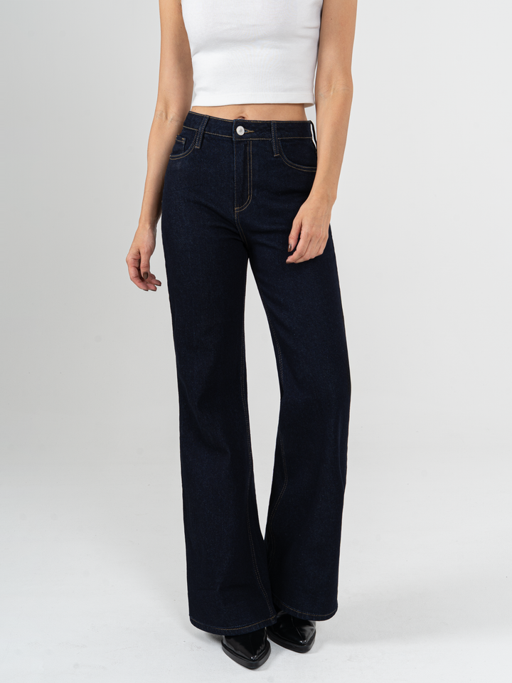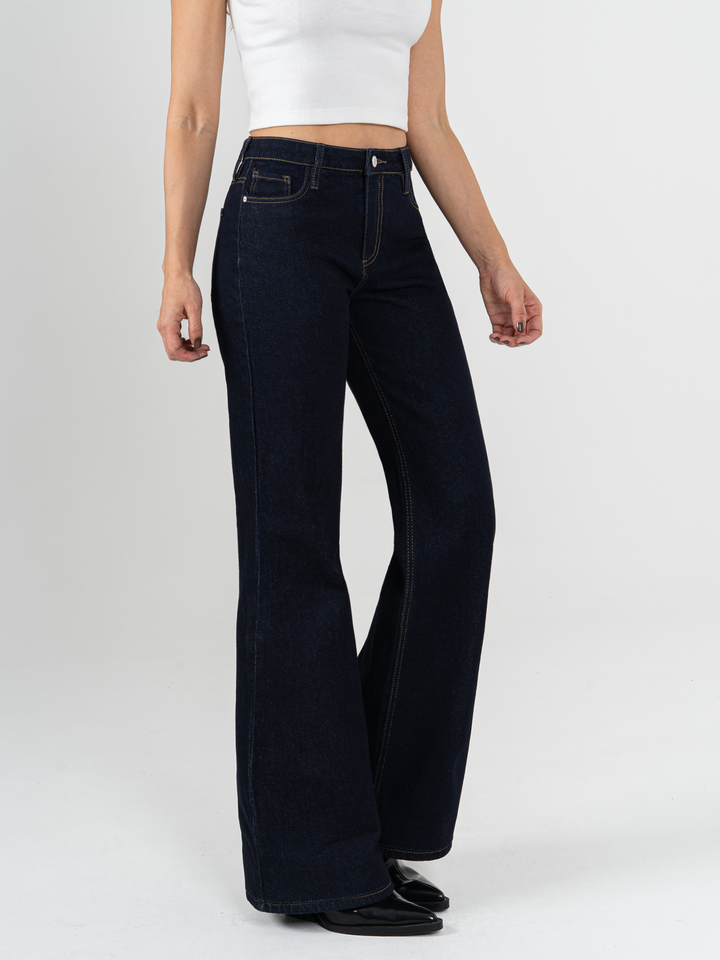 Jean flare stretch, bota ancha, tiro alto, tono azul oscuro, silueta ajustada, diseño cinco bolsillos.