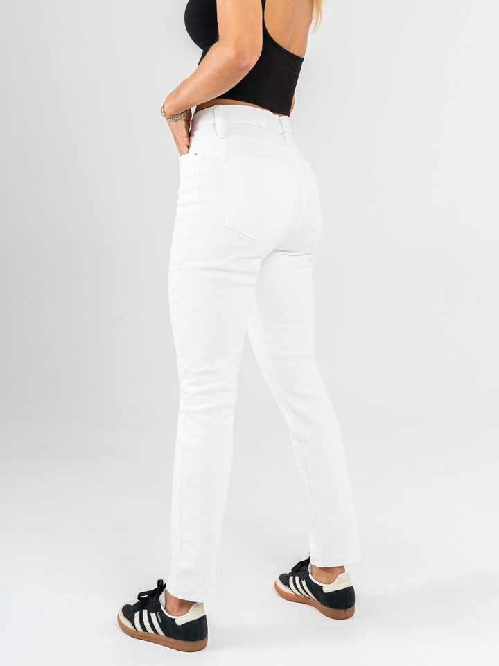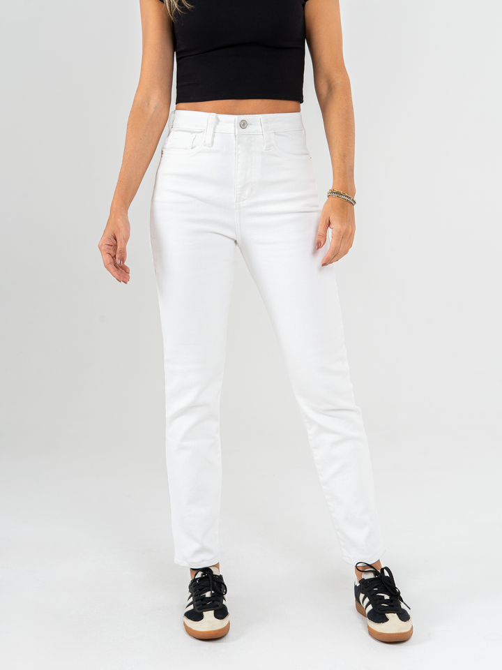 Pantalón mom fit stretch, tiro alto, tono ivory, cintura ajustada, pierna holgada, diseño cinco bolsillos.