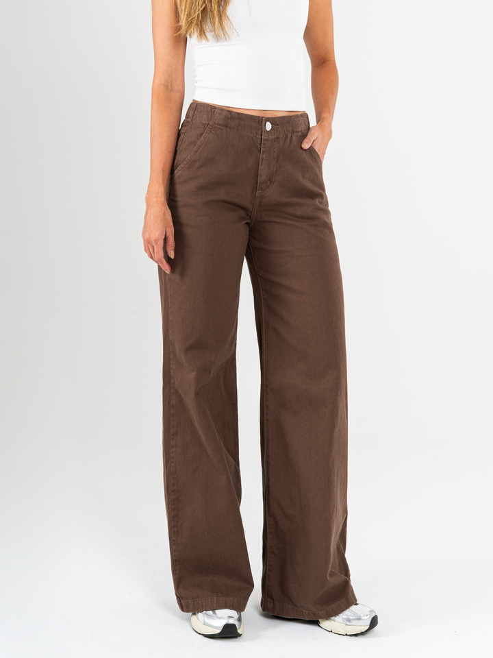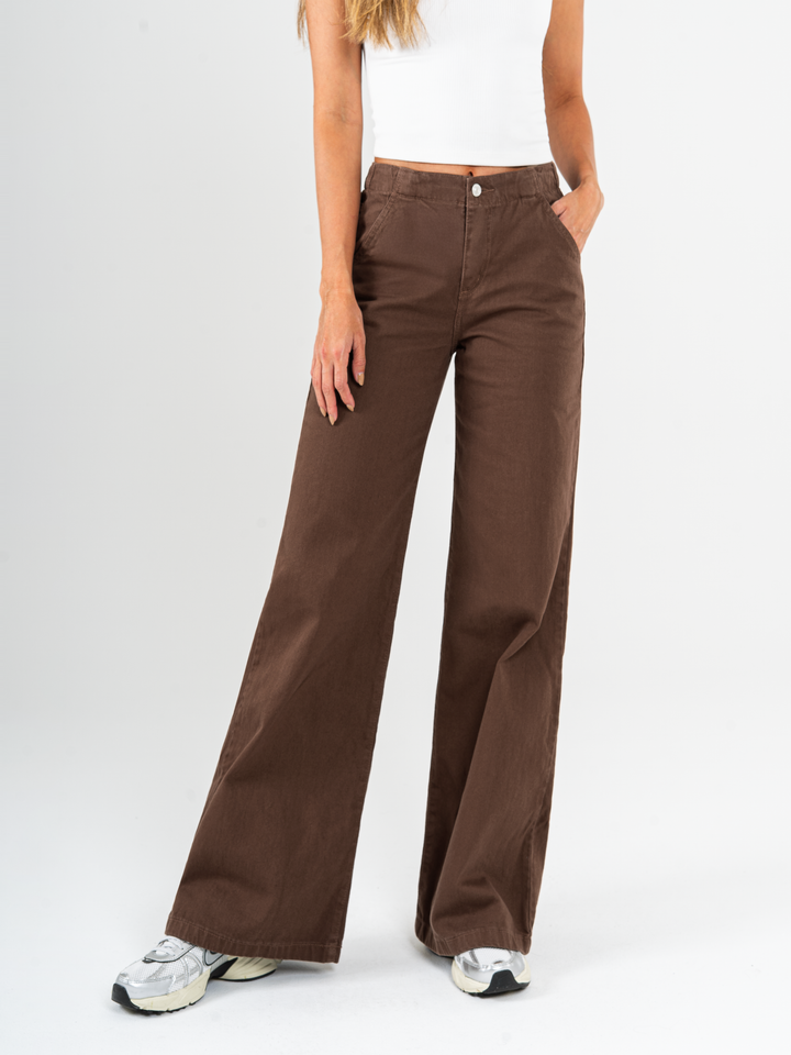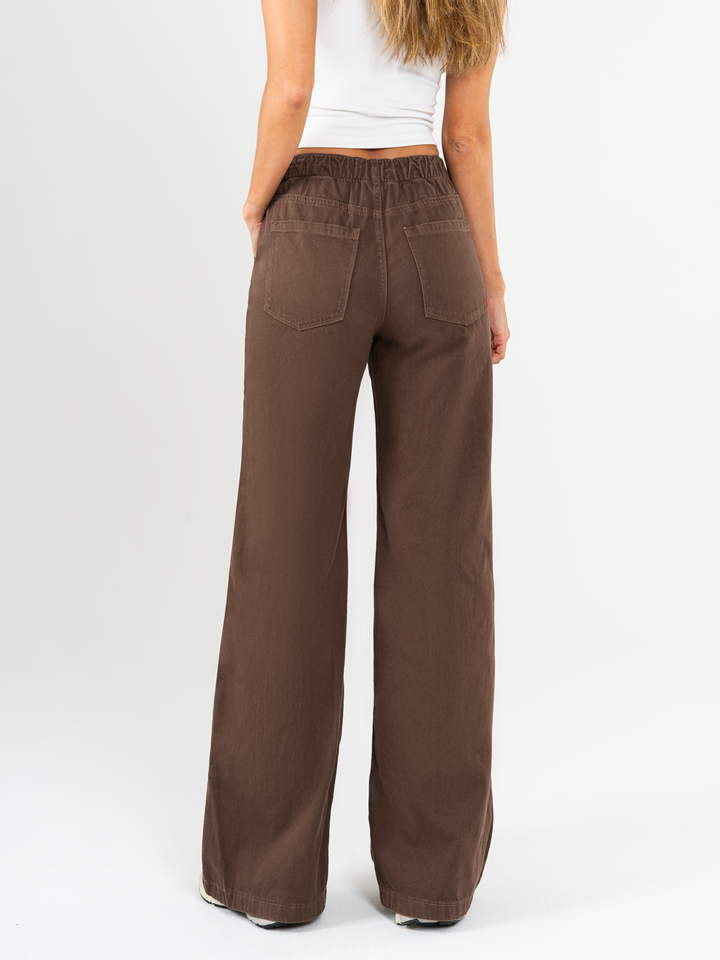 Pantalón palazzo, rígido, tiro medio, tono café, cintura con elástico, silueta holgada.