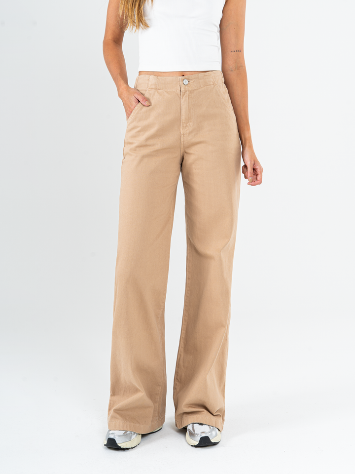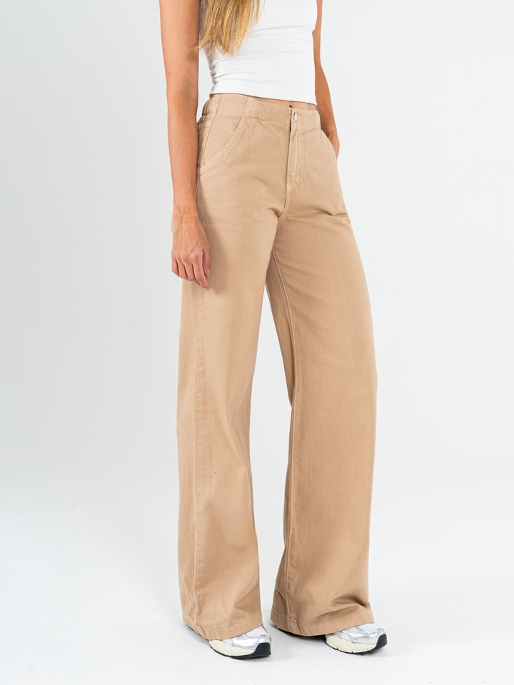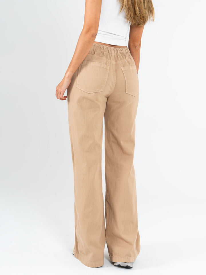 Pantalón palazzo, rígido, tiro medio, tono caqui, cintura con elástico, silueta holgada.