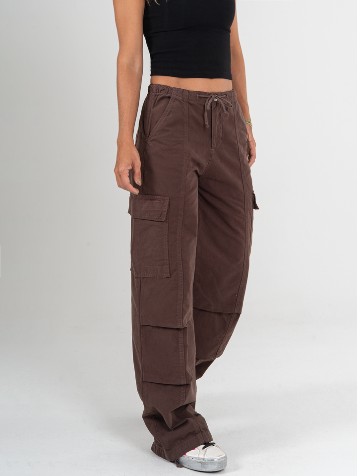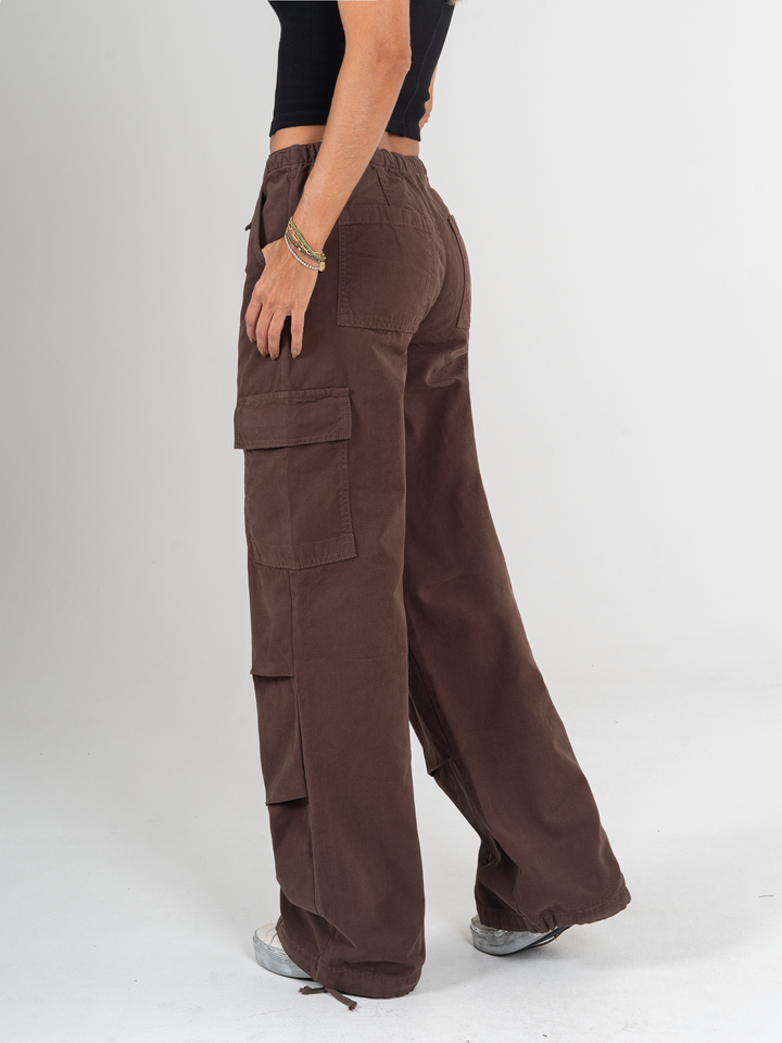 Pantalón Cargo rígido, tiro alto, tono cafe, diseño con bolsillos laterales, silueta amplia.
