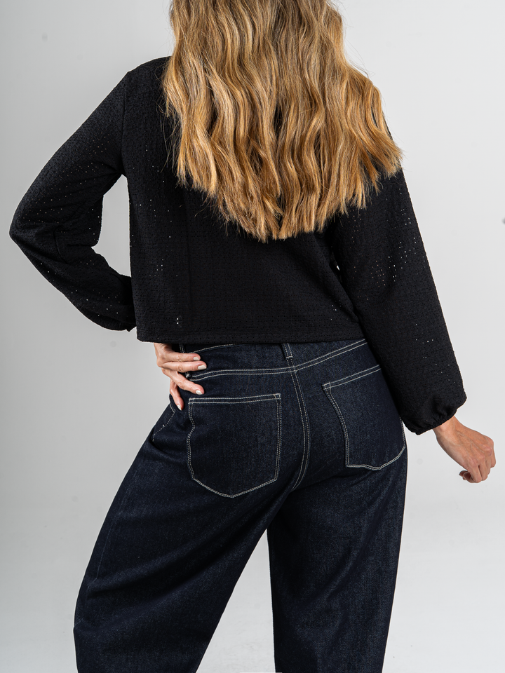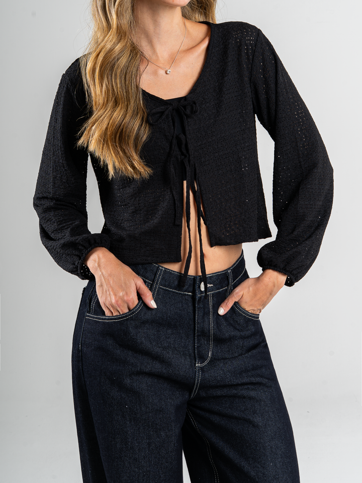 Top manga larga, stretch, amarre delantero, tono negro