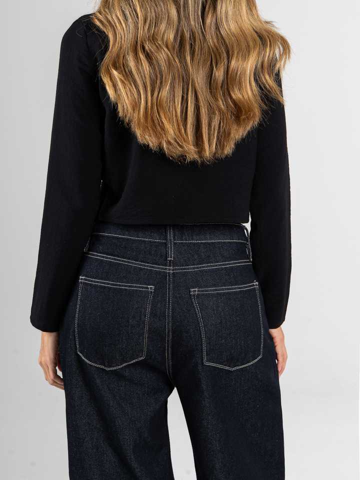 Top manga larga, tejido plano, escote en V, botones delanteros, tono negro.