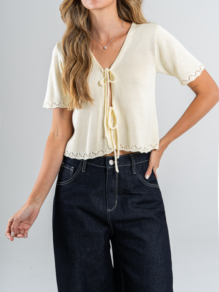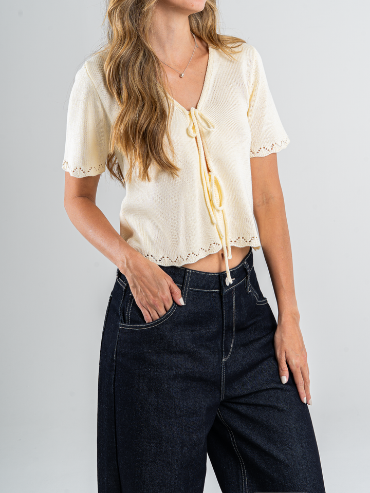 Top tejido acanalado, con amarre delantero, manga corta, tono amarillo.