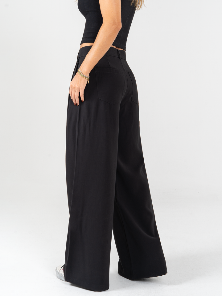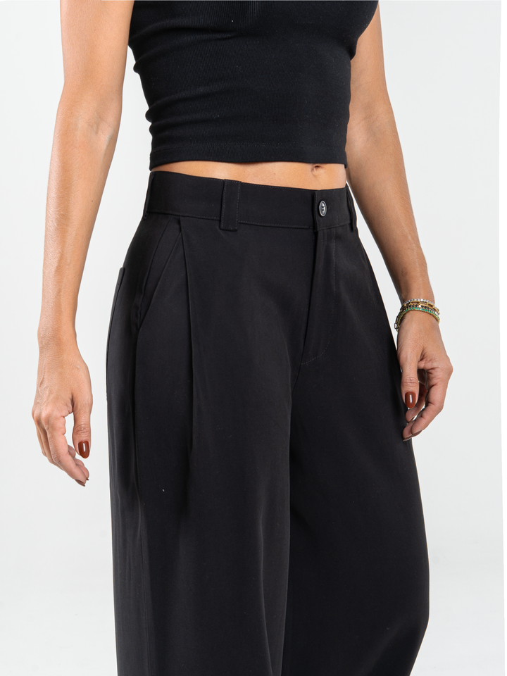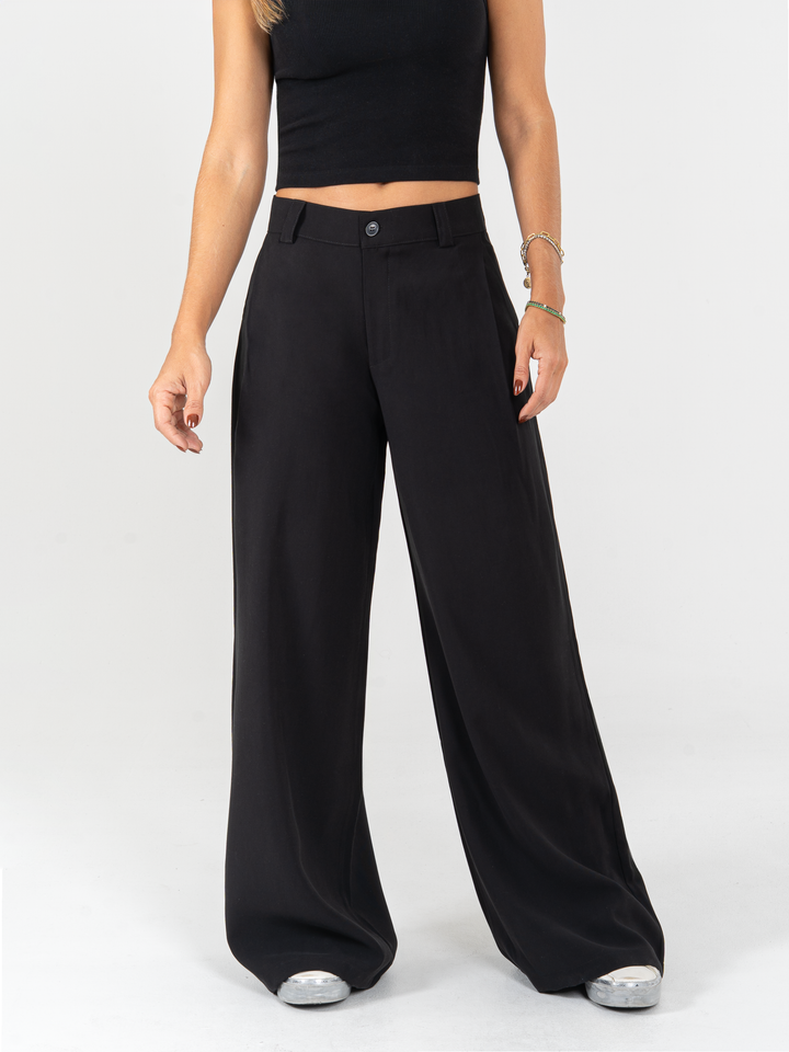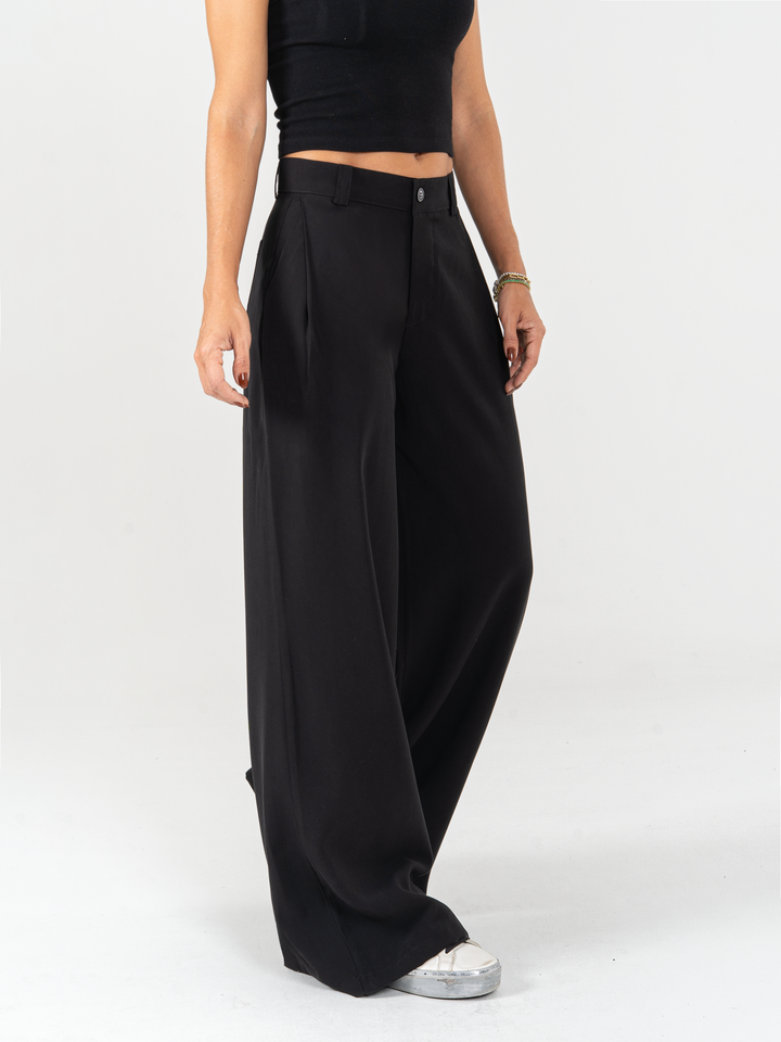 Pantalón palazzo, prenses, tono negro, tejido plano liviano, tiro alto, bolsillo al diagonal, silueta amplia.