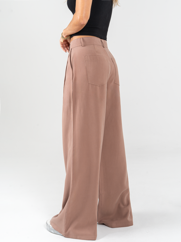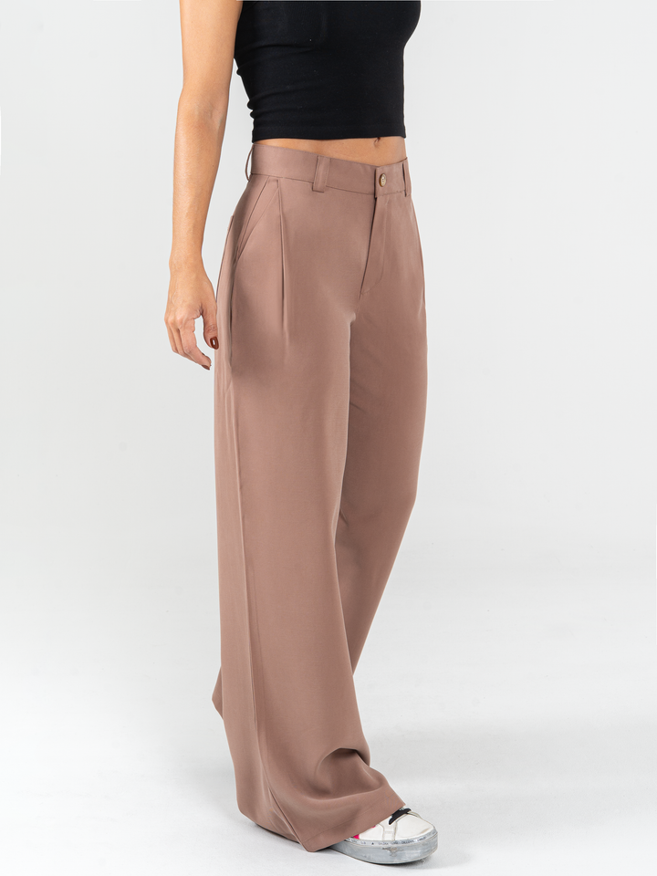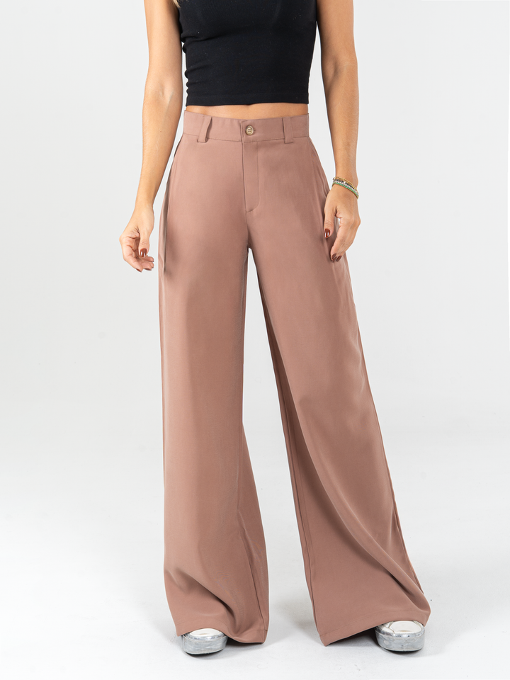 Pantalón palazzo, prenses, tono cafe, tejido plano liviano, tiro alto, bolsillo al diagonal, silueta amplia.