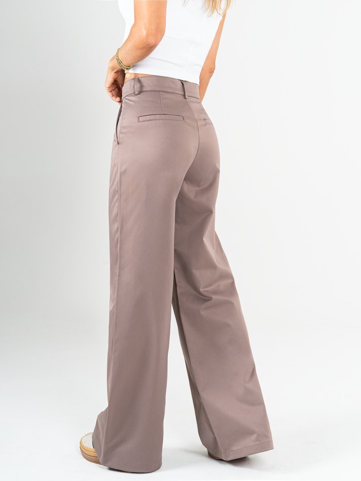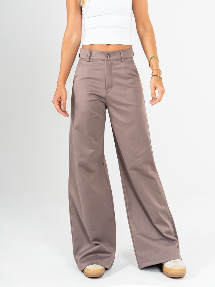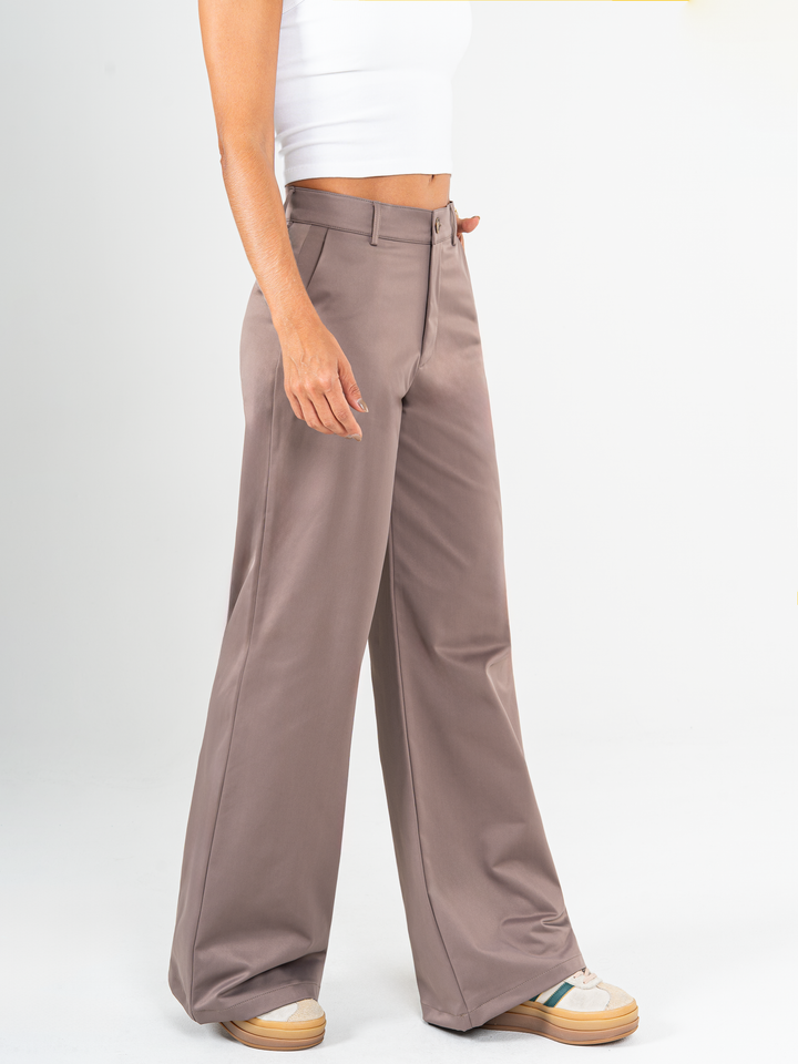 Pantalón palazzo, sin prense, tiro alto, tejido plano liviano, tono cafe, bolsillo ribete , silueta amplia.